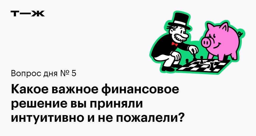 💳 Челлендж: честно изучаем и улучшаем свои денежные решения. День 5 Иногда самые правильные решения мы принимаем не по расчету, а по внутреннему ощущению. Купили квартиру, сменили работу, вложились во что-то — просто потому, что «почувствовали, что так надо». А потом оказалось, что все было правильно. А у вас было такое? Расскажите свою историю: https://t-j.ru/m-tg/challenge-money-psychology-5/ #психология_финансов