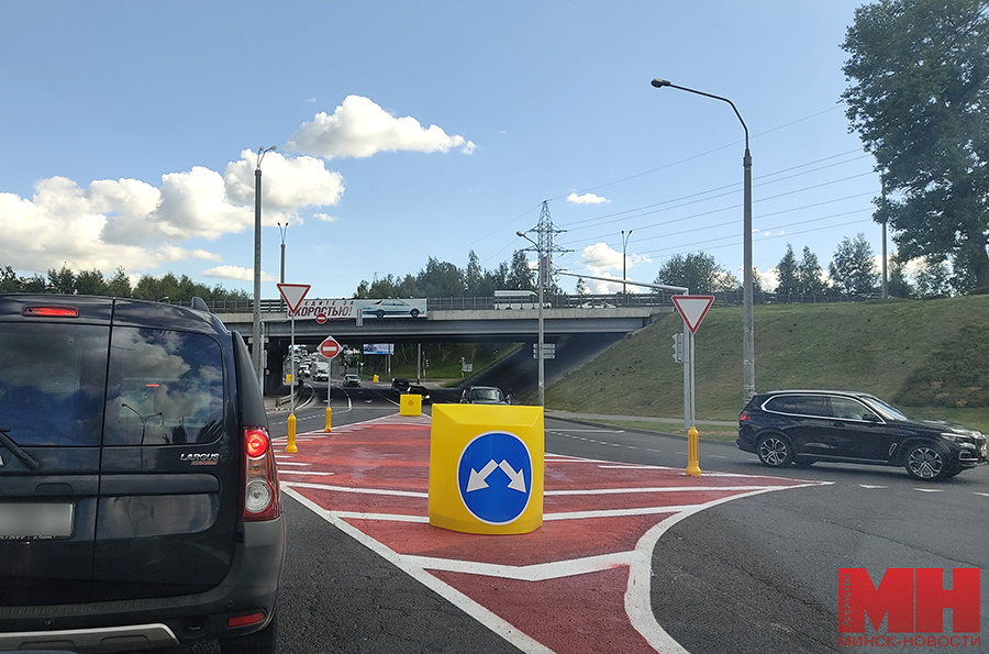 В столице на пересечении МКАД, Игуменского тракта и ул. Бабушкина существенно изменена схема организации дорожного движения. Нововведения произошли в минувшие выходные и вызвали широкое обсуждение в водительских кругах. Корреспондент агентства «Минск-Новости» отправился на место, чтобы узнать, как там движется транспорт. Еще на подъездах к путепроводу, а также на спусках с МКАД заблаговременно установлены информационные щиты, на которых изображена новая схема движения транспорта. На проезжую часть нанесены белая и красная разметки. Дорожные знаки указывают направления движения по полосам, где въезд запрещен и с каких сторон следует объезжать препятствия. Как пример — на тумбах, выкрашенных в ярко-желтый цвет, нанесено изображение дорожного знака 4.2.3, «Объезд препятствия справа или слева». К слову, скорость движения транспортных средств ограничена 40 км/ч. Раньше в будние дни на этом участке возникали проблемы с пропускной способностью транспорта, особенно в часы пик. Проблематично бы