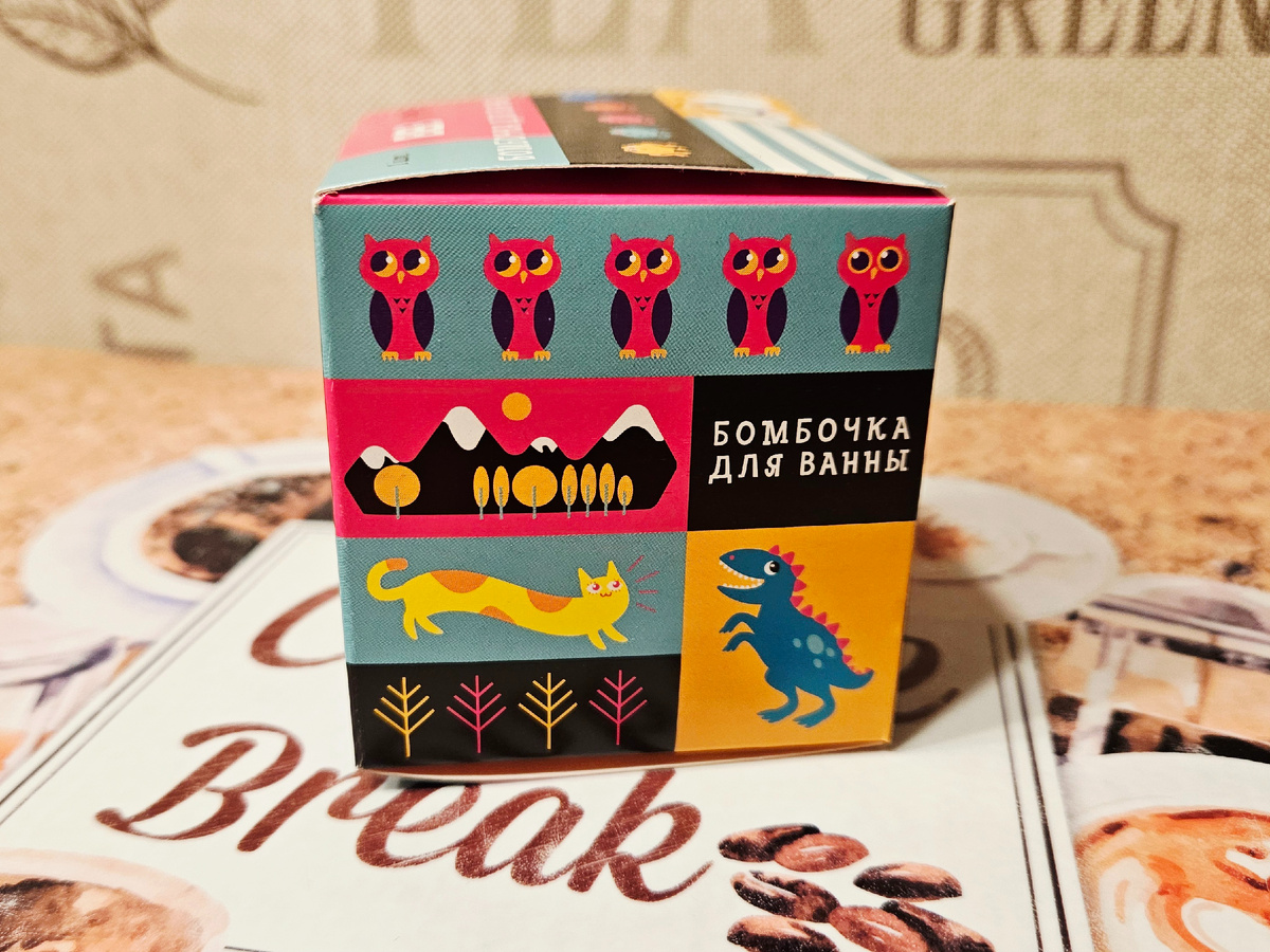 Бомбочка упакована в пленку и уложена в коробочку с окошком, через которое видно цвет. Вообще их несколько в серии и разные по цветам. У нас желто-оранжевая. Коробочка очень яркая, привлекающая внимание. На ней карикатурные рисунки животных.