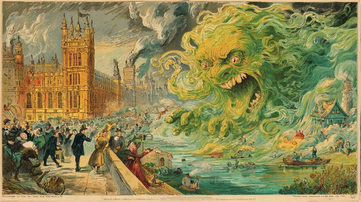 Лондон XIX века — это не про индустриальную мощь и имперское величие. Это — про тонны нечистот, величественно текущих по улицам прямиком в Темзу. Всё изменилось в 1858 году, когда сама река предъявила лондонцам счёт за годы пренебрежения. Как это произошло? К середине XIX века Лондон был промышленным гигантом, буквально задыхающимся в собственных отходах. Его население стремительно росло, а инфраструктура не поспевала. В то время город не имел централизованной канализации — все нечистоты из домов, фабрик, скотобоен и туалетов смывались прямо в реку Темзу через стоки, предназначенные для дождевой воды. Река, будучи некогда источником жизни, медленно отравляла всё вокруг. Переломным же моментом стала аномальная жара, настигшая Лондон летом 1858 года. «Великая вонь» атаковала город — она въедалась в одежду, вызывала приступы тошноты. Главной же её мишенью стал британский парламент, чьи окна выходили прямиком на Темзу. Парламентарии, пытаясь спастись, использовали шторы, пропитанные хлорно