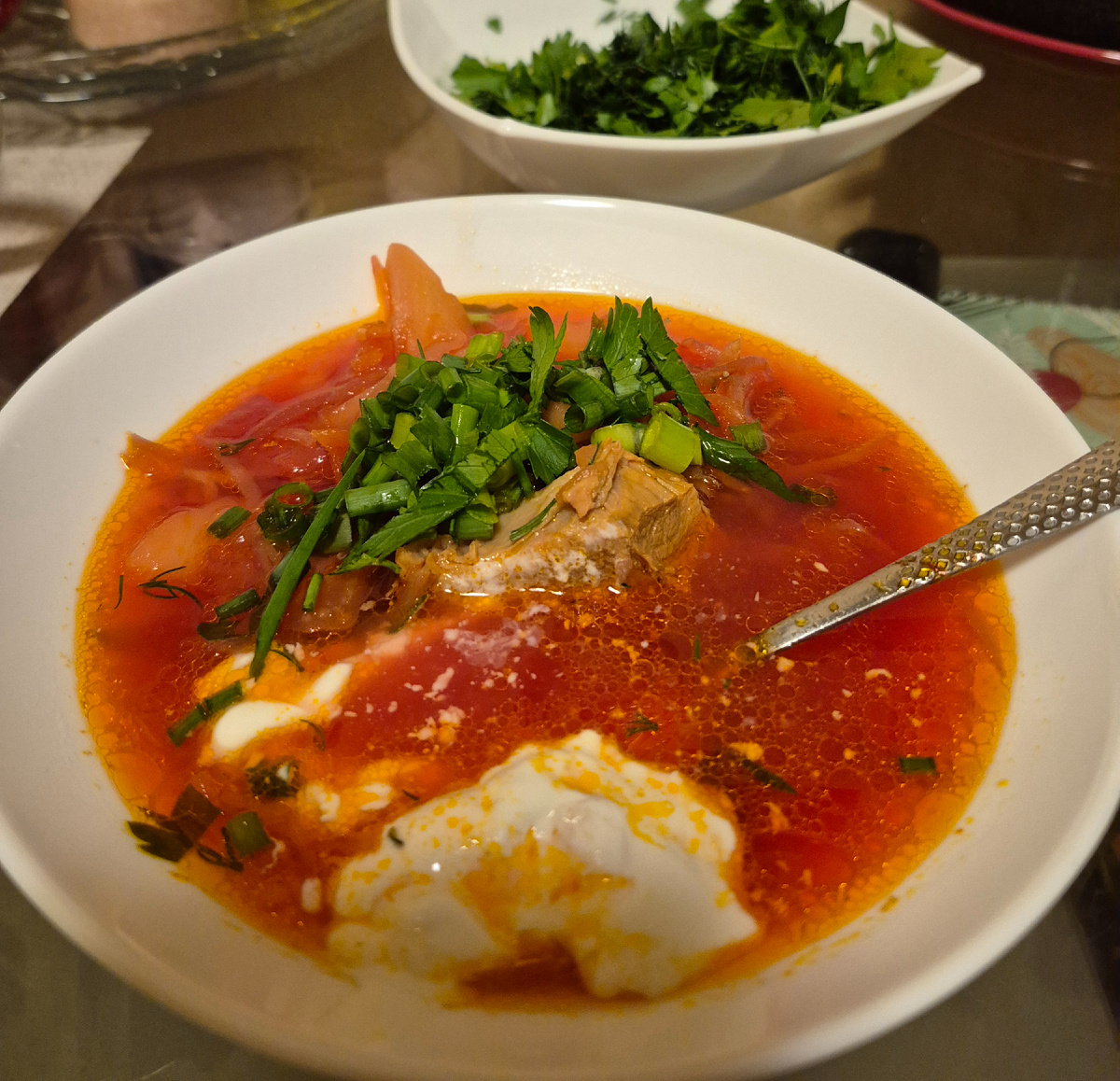 Добрый день,вот друзья решила сварить борщ,купила кусочек свинины мякоти и обязательно болгарский перец, только дорогой испанский и начала готовить,все овощи тру на тёрке и обжариваем, вливая, потом бульон,доводим до готовности,конечно разные специи,но вот варю борщ без лука попробуйте, какой он вкусный.Игридиенты:помидоры 4шт или 7шт черри,или сливки,перец сладкий,картофель 4 шт средних,2шт крупные свёклы,морковь,лече махеев,мясо свинина,немного капусты,зелень,сухой чеснок,приправы,кастрюля 4литра.