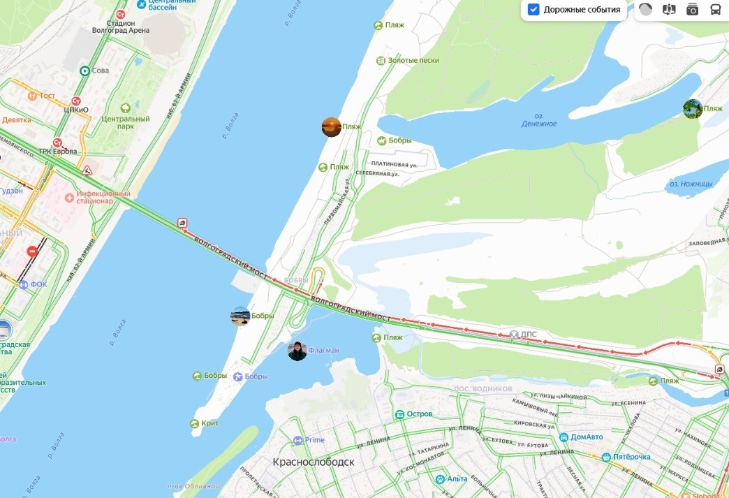 «Яндекс. Пробки» показывает сейчас в Волгограде пробки 3 балла, дороги считаются свободными для проезда. Однако на «танцующем мосту все выглядит куда гораздо серьезнее. Вся дорога до Волгограда на карте окрашена в красный цвет. Это означает, что водители здесь фактически не двигаются, затор очень плотный.