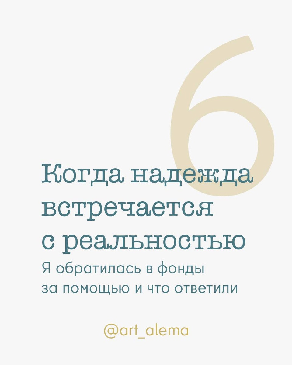 Глава 6. Когда я поняла, что самостоятельно накопить на коляску не получается (цены росли быстрее моих сбережений), решила обратиться за помощью к благотворительным фондам. Казалось бы, есть организации, которые помогают людям в сложных ситуациях. Тем более, почти каждый, кому я рассказывала о сборе, спрашивал: «А в фонды обращалась?» Мы написали письма в российские благотворительные организации. Все, что давали другие, и те, что я самостоятельно находила в сети. По данным из интернета, у них есть льготы на пошлину и возможно даже на доставку медицинского оборудования. Но каждый раз получала один и тот же ответ: «Извините, мы не можем вам помочь». Или просто игнор. У многих фондов были ограничения: • помогают только детям, • сумма оборудования не должна превышать 350 000 руб., • поддержка только при онкологии или тяжелых заболеваниях. Однажды мне позвонила женщина из фонда - единственная, кто отреагировал адекватно на мою просьбу. Она сказала: «Мы помогаем только детям, но я дала ва