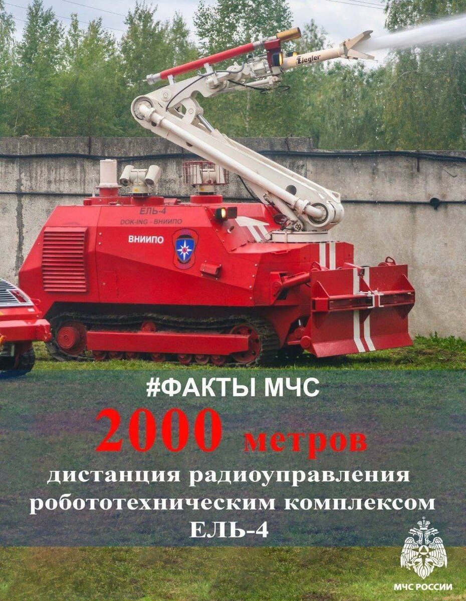 #ФактыМЧС 🚒Робототехнический комплекс ЕЛЬ-4 Задействуется при тушении пожаров на опасных промышленных и взрывоопасных объектах. Подает струю воды на 70 метров, пену - на 50 метров, тушит через заграждения и завалы. 9-тонная самоходная спецтехника оснащена: ✅бульдозерным ковшом для устранения препятствий на пути следования; ✅гидравлическим хватом для разбора завалов; ✅гусеничным ходом, увеличивающим проходимость. МЧС Башкортостан Подписывайся на МЧС России в Telegram | MAX