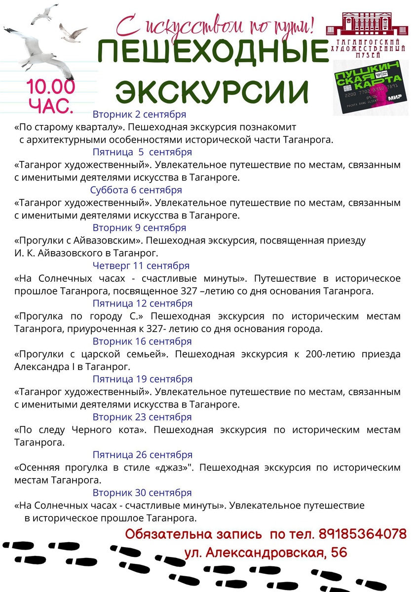 Дорогие друзья! ‼Оба корпуса Таганрогского художественного музея закрыты для проведения ремонтно-реставрационных работ. 🧍🧍♂️🧍🧍♂️Но сотрудники музея продолжают проводить пешеходные экскурсии, темы которых связаны с историческим прошлым города, художниками и людьми искусства, бывавшим и творившими в Таганроге, героями полотен из коллекции ТХМ, нашедшими отражение их истории на страницах городской летописи. 🏛Историческую часть Таганрога зачастую называют музеем под открытым небом. Совершите вместе с нами увлекательные летние прогулки на свежем воздухе, отдыхайте красиво! Более подробная информация на сайте https://clck.ru/3Dh52P и в афише. Сбор у калитки корпуса «Русское искусство» по адресу: ул. Александровская, 56. Экскурсии проводятся в утренние комфортные часы — в 10.00. 🤝Пешеходную экскурсию можно также заказать в любое удобное для вас время и в любой день. Тел. 89185364078 #таганрогский_художественный_музей #пешеходные_экскурсии_в_ТХМКультура