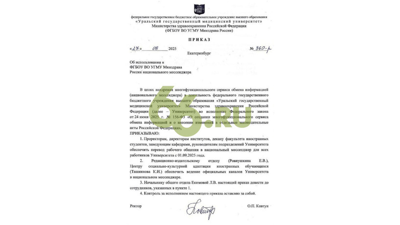 Новые правила для преподавателей Уральского государственного медицинского университета (УГМУ) начнут действовать с 1 сентября. В Мах заведут и официальные каналы вуза. «Проректорам, директорам институтов, декану факультета иностранных студентов, заведующим кафедрами, руководителям подразделения университета обеспечить перевод рабочего общения в национальный мессенджер для всех работников», — говорится в приказе (есть в распоряжении редакции) ректора УГМУ Ольги Ковтун. Корреспондент 66.RU отправил запрос в пресс-службу вуза. Мы опубликуем ответ, когда он придет в редакцию. * принадлежит корпорации Meta, признанной в России экстремистской