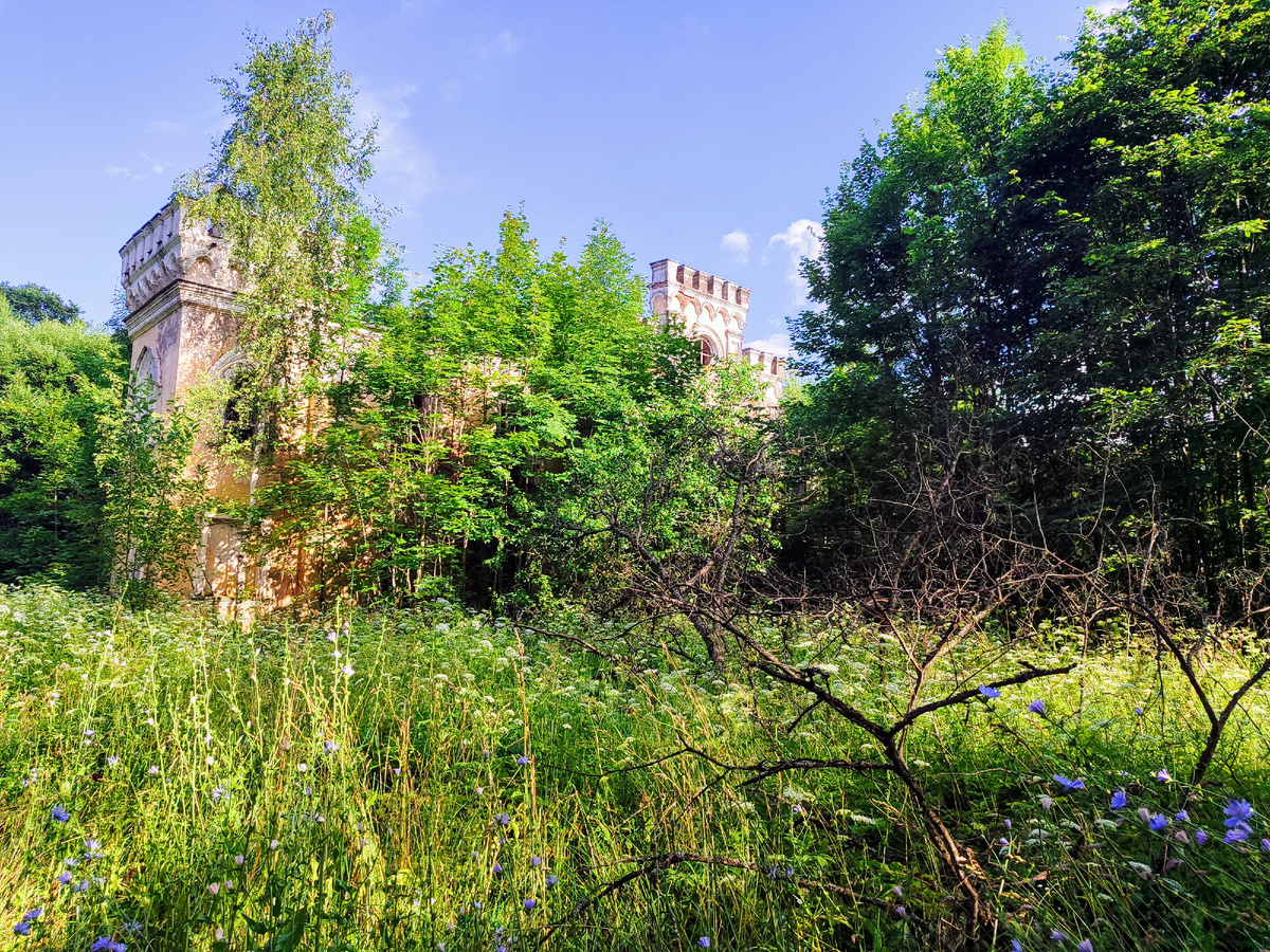 Двадцати лет хватило. Чтобы дворец в руины превратился. Зарастающие бодрым леском.