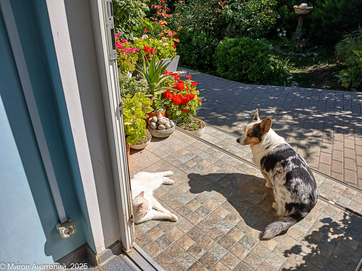 Корги Тильда с кошкой Марусей ждут на крыльце, когда я выйду из дома. Маруся в ожидании завтрака. А Тильда просто за компанию, в надежде, что и ей перепадёт какой-нибудь деликатес из кошачьего меню. Маруся недавно сделала заявление, что не хочет она быть простою крестьянкой, а хочет быть вольною царицей. Простые крестьянки - кошка Кокошка и Мамаша Че - за обе щёки уплетают сейчас на кухне сухой корм. А Марусе надо, чтобы "служили ей бояре да дворяне и наливали ей заморские вины". Ну, в том смысле, что кормить эту кошечку надо особо, да чтобы меню было разнообразным. Стоит заметить, что Маруся, которая живет у нас уже девять лет, в еде никогда не привередничала. Поскольку возникла она на нашем дворе беспризорной тощей замухрышкой, то, надо думать, питалась она некоторое время, чем Бог пошлёт, наверное, и в мусорные баки заглядывала. Всегда у нас Маруся ела, что дадут, чревоугодием не страдала, и никогда на однообразие стола не жаловалась. Ну разве что к сырому мясу была очень неравнод