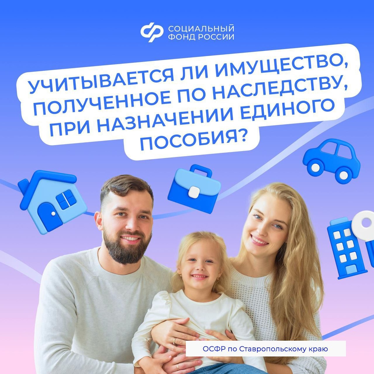 При назначении единого пособия учитывается имущество, полученное по наследству 🏠Отделение СФР по Ставропольскому краю назначает единое пособие семьям с доходами ниже регионального прожиточного минимума на человека (с начала 2025 года на Ставрополье это – 15960 рублей). 🔤Одним из критериев при определении права на выплату является имущество, принадлежащее семье на день обращения за пособием. 🏡🚗Если на момент подачи заявления у члена семьи в собственности находится имущество, которое он получил по наследству — право собственности зарегистрировано в Росреесте, то это имущество будет учитываться специалистами ОСФР по Ставропольскому краю. Например: семья с двумя детьми подала заявление на единое пособие. У них в собственности есть квартира 54 кв.м. В прошлом году супруга заявителя получила по наследству квартиру площадью 33 кв. м. На момент подачи заявления на единое пособие право собственности на квартиру зарегистрировано, и супруга заявителя является ее владельцем. При оценке иму