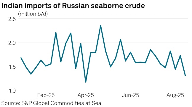 По данным CAS, в августе Россия экспортировала в Индию 1,5 млн баррелей сырой нефти в сутки, что меньше, чем 1,6 млн б/с в июле и 1,8 млн б/с в мае.