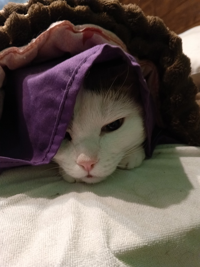 Руня - просто золото. Он ласковый, ненавязчивый, непривередливый, тихий (если не время тыгыдыка) и очень трогательный (в том плане, что его хочется трогать и всячески жамкать). Обожает засады и всяческие "норы" из одеял и подушек. А вот в закрытую лежанку залезать не желает.