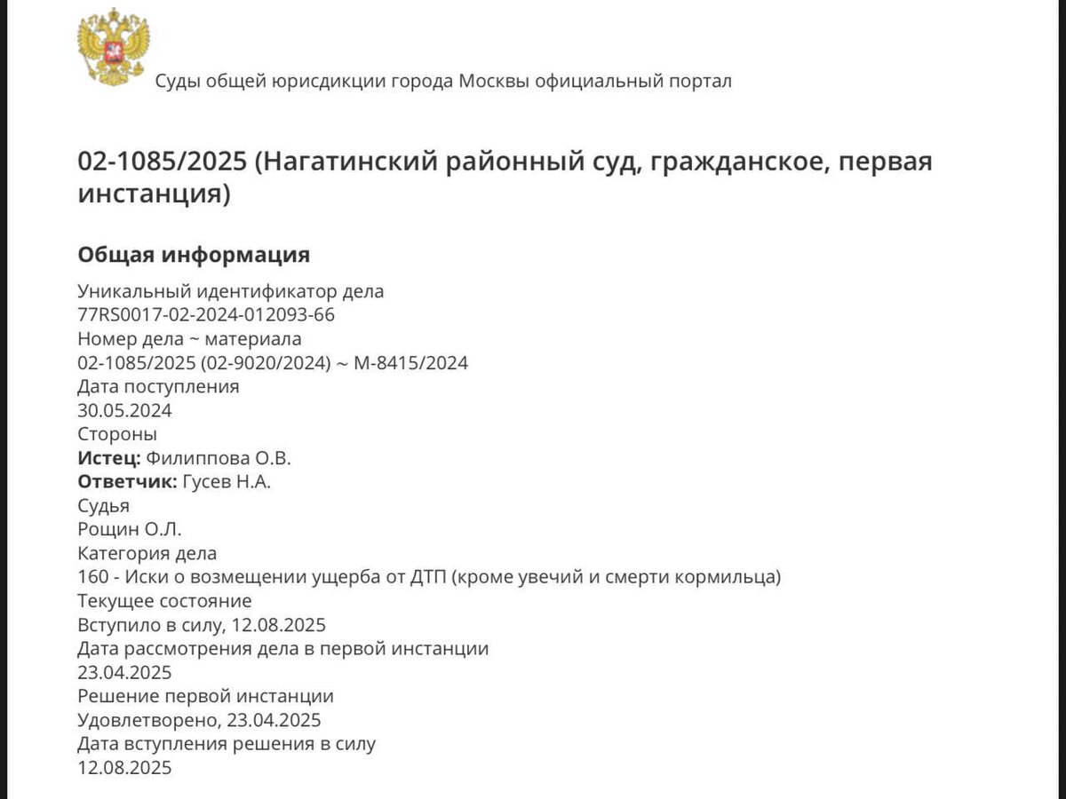 Аналогичное дело было рассмотрено в Нагатинском суде г. Москва по ДТП — продолжаем серию «О делах о ДТП», мы принимаем участие в делах по всей России. Дела о ДТП по всей России: взыскиваем разницу сверх ОСАГО в пользу потерпевших 🚗⚖️ 🧑⚖️ Кейс: Нагатинский районный суд г. Москвы, дело № 02-1085/2025, решение от 23.04.2025 (изготовлено в окончательной форме 11.07.2025). - Истец: наша доверительница Ф. - Ответчик: Г. - Суть: взыскание разницы между страховой выплатой по ОСАГО/ДСАГО и реальным ущербом авто. Что произошло 💥 - ДТП от 27.03.2023: Volkswagen (истец) и Chevrolet (ответчик). - Вина водителя ответчика подтверждена материалами ГИБДД. - Страховщик по ОСАГО выплатил с учетом износа: 457 224,74 руб. (в т.ч. ДСАГО 57 224,74). - Фактический ущерб без учета износа: 800 343,14 руб. - Разница к взысканию с виновника: 343 118,84 руб. Как мы работали 💼 - 📑 Собрали и представили материалы ГИБДД, провели независимую оценку ущерба без учета износа. - ⚖️ Сформировали правовую позицию
