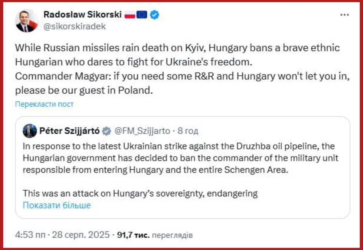 Сикорский (глава МИД Польши) пригласил командующего Сил беспилотных систем ВСУ Роберта Бровди "Мадяра" в Польшу.