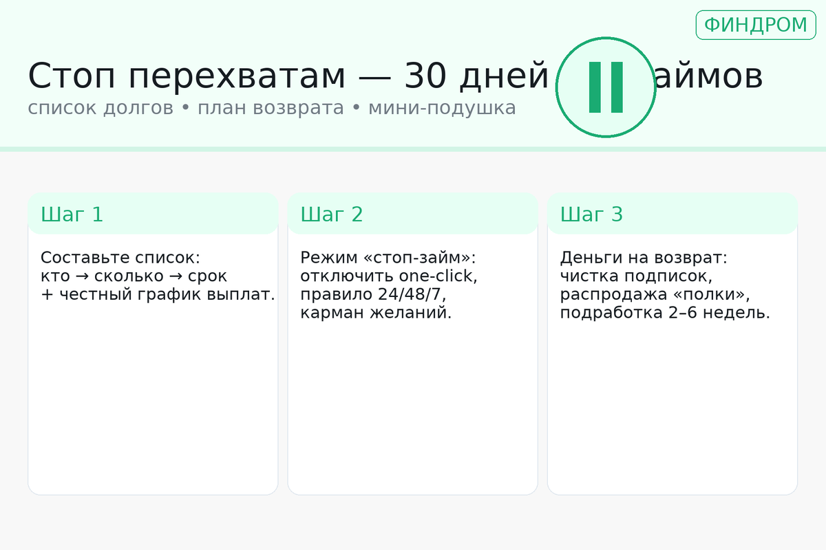 «Перехвачу до зарплаты — и забудем». Не забудем. Частые займы у друзей — это не про трёхсотку на кофе, а про системную дыру в бюджете и отношениях. Хорошая новость: цикл «занял — отдал — опять занял» лечится не чудом, а понятным планом. «ФИНДРОМ» — как раз про него. Ответьте на три «да/нет»: Составьте список кто → сколько → дата займа → обещанная дата возврата. Отдельно — причины.
