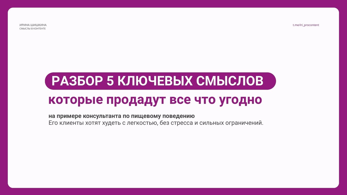 Многие слышали про продающие смыслы в блоге, но мало кто понимает, какие именно и, главное, как их нужно транслировать. В одной из статей я давала список из 15 смыслов, которые должны быть в блоге эксперта. В этой статье разберем 5 ключевых смыслов, благодаря которым можно продать все что угодно. На связи Ирина Шишкина, контент-маркетолог и смысловик. Более 6 лет работаю с контентом в разных нишах: от продвижения мясокомбината и антиквариата до психологов и художников. Помогаю экспертам создать продукт с чеком 20-40тыс и донести ценность себя и своего продукта, чтобы делать стабильные 1-2-3 продажи в месяц, уделяя соцсетям 10 часов в неделю. Сегодня разберем составляющие 5 главных смыслов в контенте на примере консультанта по пищевому поведению. Его клиенты хотят худеть с легкостью, без стресса и сильных ограничений. Смысл №1