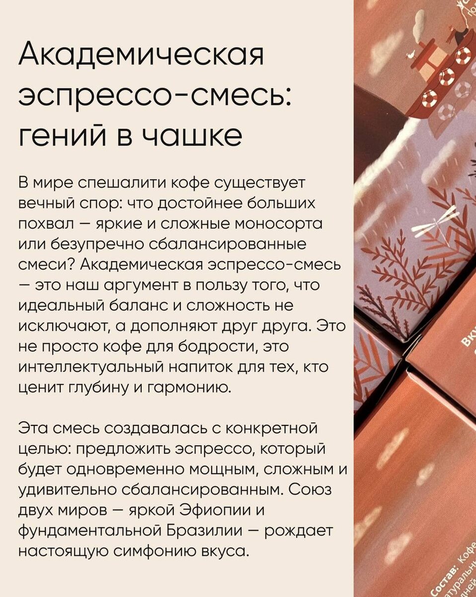 Что получится, если соединить фруктовую яркость Эфиопии Сидамо и шоколадную основу Бразилии Фармерс Блэнд? Идеальный эспрессо. 🙌🏻 Краткий обзор Академической эспрессо-смеси, которая бросает вызов стереотипам.📚 Приобрести эспрессо-смесь можно на нашем сайте или озон 📦