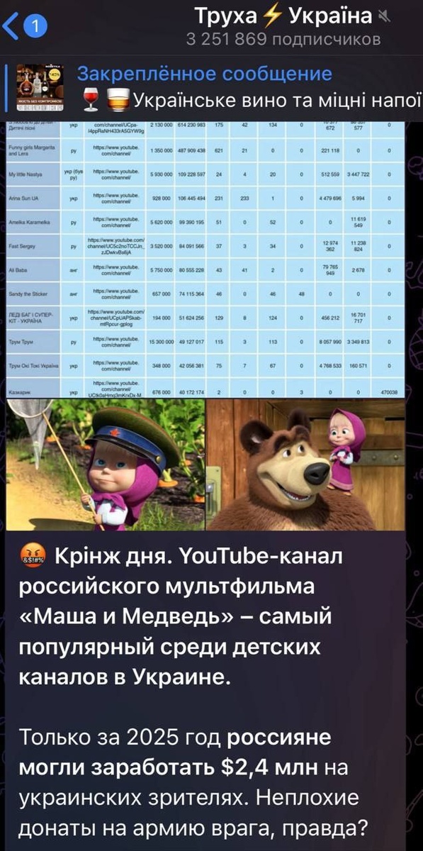 2,4 млн долларов заработал российский мультфильм «Маша и Медведь» на украинских зрителях за 2025 год — Детектор медиа YouTube-канал мультфильма занял первое место среди детских каналов в Украине. В украинском поезде сущий кошмар.