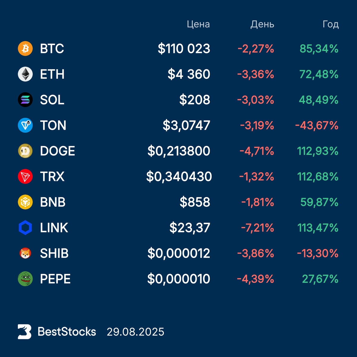 Курсы основных криптовалют: Bitcoin, Etherium, Solana, Toncoin, Dogecoin, TRON, BNB, Chainlink, Pepe, Shiba Inu на текущий момент