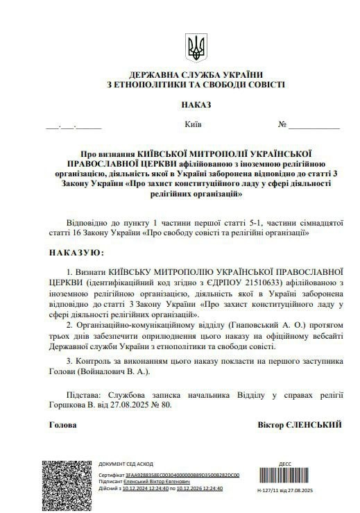 ГЭСС назвала Киевскую Митрополию УПЦ аффилированной с Москвой 27 августа 2025 Госслужба по этнополитике и свободе совести приняла решение о признании Киевской Митрополии Украинской Православной Церкви аффилированной с Москвой. Соответствующший указ подписал глава ГЭСС Виктор Еленский. В тексте сообщения на сайте ГЭСС указано, что по результатам исследования чиновников ГЭСС служба выявила признаки аффилиации Митрополии УПЦ с РПЦ, что является нарушением Закона Украины «О свободе совести и религиозных организациях». В связи с этим ГЭСС направила Киевской митрополии УПЦ предписание об устранении нарушения закона. В ГЭСС констатировали, что Предстоятель УПЦ Митрополит Онуфрий в своем письме заявил «об отказе выполнять указанное предписание». По мнению ГЭСС, это подтверждает наличие организационных связей УПЦ с РПЦ. «Таким образом, в связи с отсутствием оснований для вывода об устранении нарушений или ошибочности вынесенного предписания в соответствии с частью пятнадцатой статьи 16 Закон