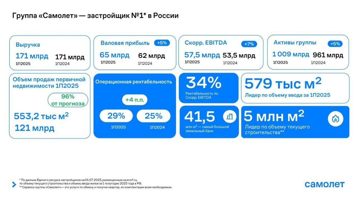 🪖 «Самолет» стабильно отчитывается за финансы и оперрезы. Смотрим на отчетность за 6 месяцев 2025 года. 🟦Выручка Группы осталась на уровне аналогичного периода прошлого года и составила 171 млрд рублей, а валовая рентабельность достигла рекордных 38% при валовой прибыли в 65,1 млрд рублей. 🟦Показатель скорректированной EBITDA достиг 58 млрд руб., что соответствует рентабельности в 34%. Операционная рентабельность бизнеса выросла на 4 п.п. до 29%. 📌Результаты первого полугодия показывают, что фокус новой команды менеджмента на оптимизации бизнес-процессов и работа над повышением операционной эффективности приносит свои плоды.
