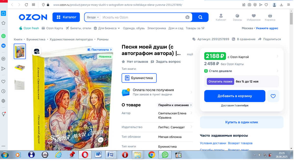 Повторяю, что бумажных книг "Песня моей души" - именно в таком виде для меня в типографии за мой счёт сделали 9 штук - это вся трилогия в одном томе. Бесплатно зря дарила Артёму Левашову и Елене Топилиной с пожеланиями как с молитвами эти книги: один из них продаёт мои молитвы и смех над моей потерей беременности от полного истощения и предательства всеми и несколько моих суицидных попыток с Бог знает сколько раз меня они предали ещё - и пусть Бог всем всё откроет, сколько раз они и как меня предали!!! Адрес продающего мою боль и смерть моего первенца - Санкт-Петербург, даже уточнили, что с моим автографом продают - за 2458 рублей чтобы нажиться сверх имеющегося, но немного даже вот ради сайта Ozon со скидкой до 2188 рублей - вместе с радующимся возможности нажиться на моём бедственном положении хозяином книжного магазина "Одиссея" - торговца Манвелян Вильгелма Самвеловича с книгами ну с заоблачными ценами.