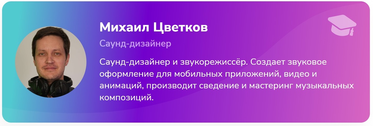 4. Автор курса — Михаил Цветков, саунд-дизайнер и звукорежиссёр с опытом в сведении, мастеринге и аудиодизайне для приложений и видео.