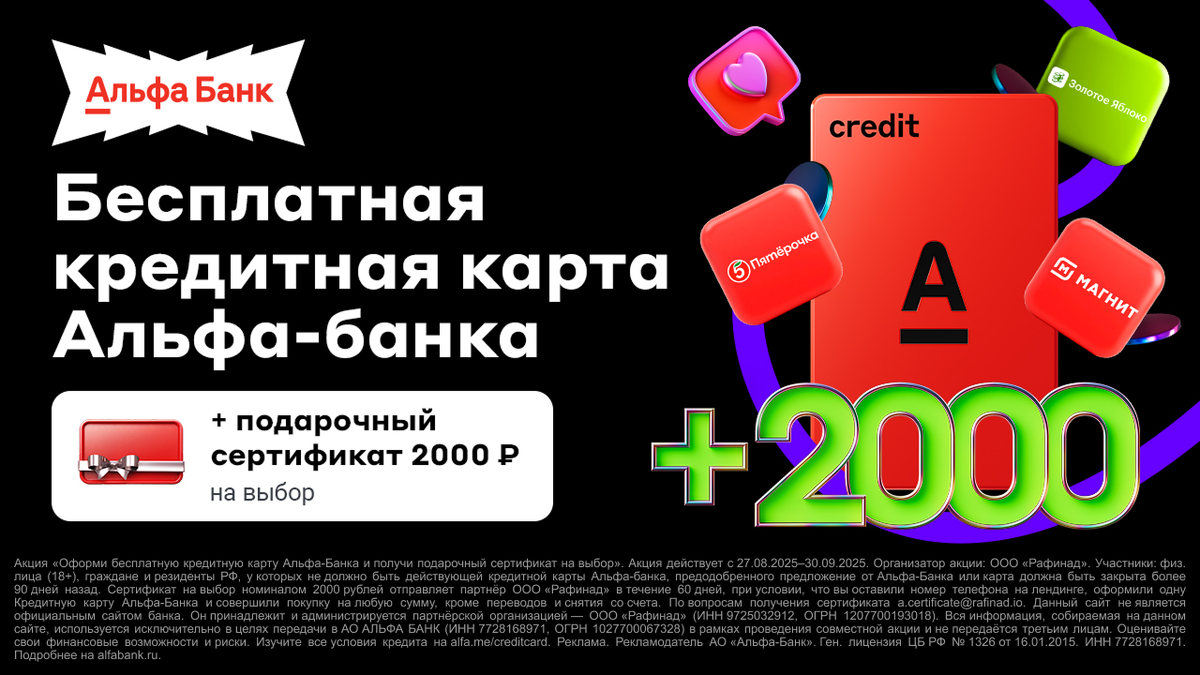 Если вы давно хотели кредитную карту Альфы, то сейчас есть прекрасная возможность дополнительно получить 2000 рублей сертификатом на выбор. Вы знаете, я люблю такие акции, где можно получить деньги почти из воздуха, поэтому делюсь. Что нужно сделать: Что можно выбрать в качестве приза - сертификат на 2000 рублей на выбор: Сертификат придет в смс на телефон, указанный при регистрации в течение 60 дней после активации карты. Участвуют клиенты, у которых нет кредитной карты Альфа-банка, или карта была закрыта более 90 дней назад Про карту: Важно: совершить транзакцию по карте, кроме снятия наличных Ссылка на открытие карты А если у вас нет и дебетовой карты, то можно получить сертификат на 1000 рублей (ЗЯ, Пятерочка, Магнит) + доп.кешбэк в размере 1000 рублей при оформлении через ссылку Сороки.
