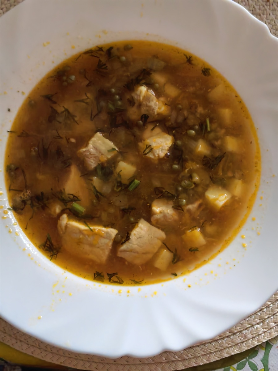На ночь замочить 100 гр. Маша и убрать в холодильник. На утро промыть и отварить 20 минут (она будет готова ровно через 20 минут. Больше по времени не варить , солить не надо!). Промыть. Мясо любое 500 гр нарезать на кубики ( по желанию можно заменить на жареный фарш) варим до готовности в подсоленной воде. ( если фарш то сразу же добавляем картофель). Лук и морковь по 1 большой штуки очистить. Морковь натереть на тёрке. Лук мелко нарезать. Обжарить лук и морковь до готовности , в конце добавить 1 ст. л томатной пасты и 1 ч. л сахара перемешать и потушить 1 - 2 минуты. В суп за 15 - 20 минут до готовности мяса добавить картофель 3 - 4 шт. среднего размера ( очистить и нарезать кубиками.) За 5 минут до готовности картофеля добавить обжарку , сухой или свежий чеснок по вкусу , хмели - сумели по вкусу и если нужно соль по вкусу, лавровый лист по желанию. Варим ещё 2 минуты и добавляем варёный маш. Варим 2 - 3 минуты. Суп готов. Подаём с посыпав зеленью по вкусу. Приятного аппетит
