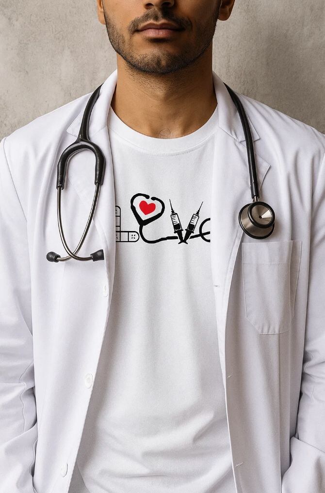 💉 Футболка для тех, кто носит заботу в сердце! Белая футболка с оригинальным принтом, где слово LOVE составлено из медицинских символов: * буква L — из пластырей, * буква O — из сердца и стетоскопа, * буква V — из шприцев, * буква E — из катетера. Стильный и символичный дизайн идеально подойдет медикам, студентам-медикам и всем, кто связан с медициной. Такая футболка — отличный подарок врачу или медсестре. 👩⚕️👨⚕️ 📦 Заказать на Wildberries по ссылке: 👉 перейти к футболке
