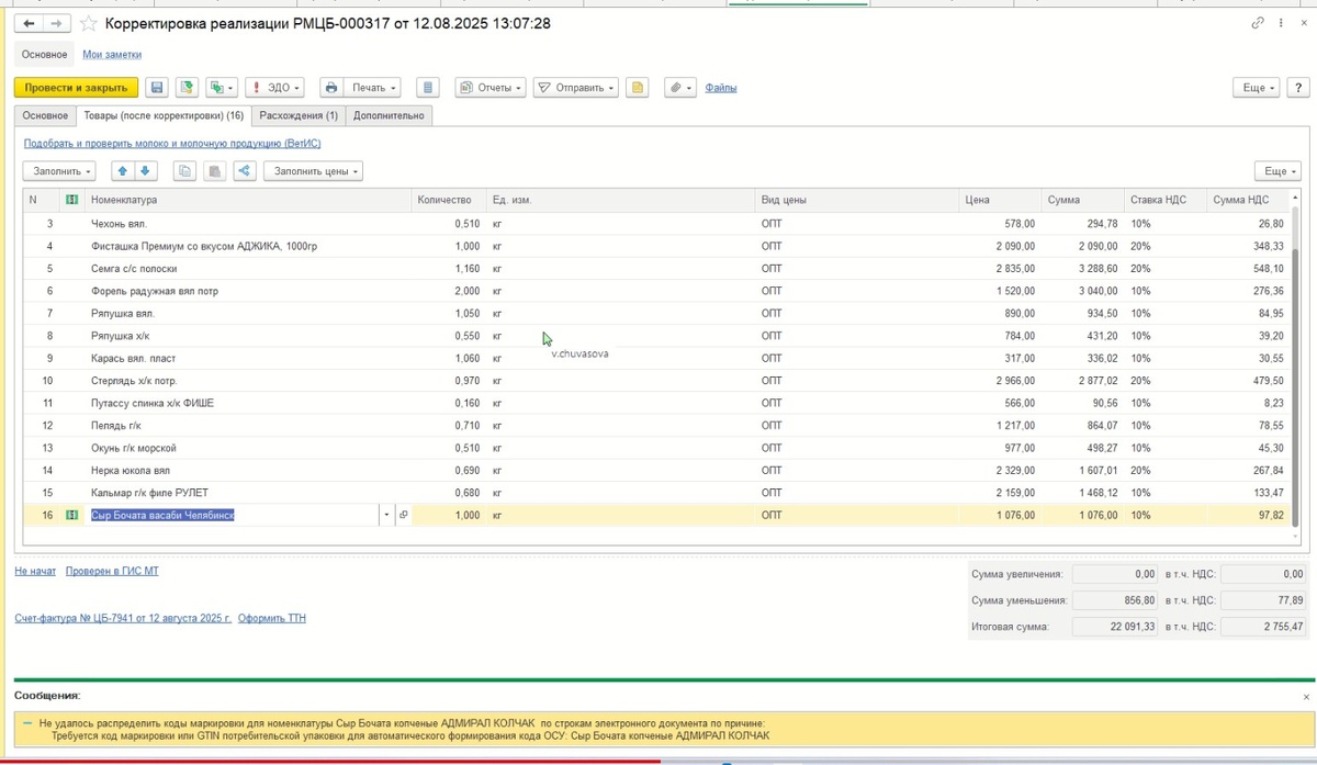 Требовалось отправить по ЭДО документ Корректировка реализации, содержащий коды маркировки. При отправке возникала ошибка: "Не удалось распределить коды маркировки для номенклатуры по строкам электронного документа по причине: Требуется код маркировки или GTIN потребительской упаковки для автоматического формирования кода ОСУ"❗