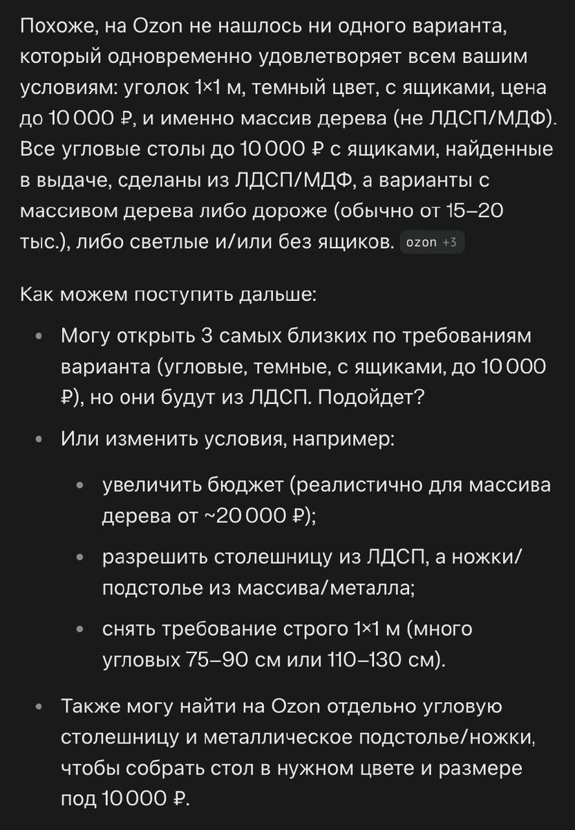🪄 Магия существует! 🖥 Браузер сам все делает, что вам нужно. 🛍 Пользуюсь таким поиском на Озоне и результаты хорошие подпирает. Если что-то не устраивает, можно дополнить свои пожелания. 🔎 Такой поиск намного упрощает стандартный ручной поиск, откидывается много хлама, что есть на маркеплейсе. На видео видно по курсору, что я ничего не делаю, браузер сам пишет, что нужно найти, сам тыкает по фильтрам, в правом окне видно в конце видео, как ИИ перебирает карточки товаров и смотрит их харрактеристики. ⌛ Так как поиск занял несколько минут, не стал записывать полностью. 👍 Результат: Само собой ничего не найдено, из дерева столы стоят дороже. Приложил скрин с результатом. ❌ Браузер пока недоступен для скачивания, но можно подать заявку на тестирование. Некоторые ждут доступа по пол года, я получил где-то дней за 10. #comet #perplexity #AI #magic #ИИ #браузер #автоматизация В этом посте есть большое видео, которое не загрузилось в Дзен. Откройте оригинал поста в телеграме, чтоб