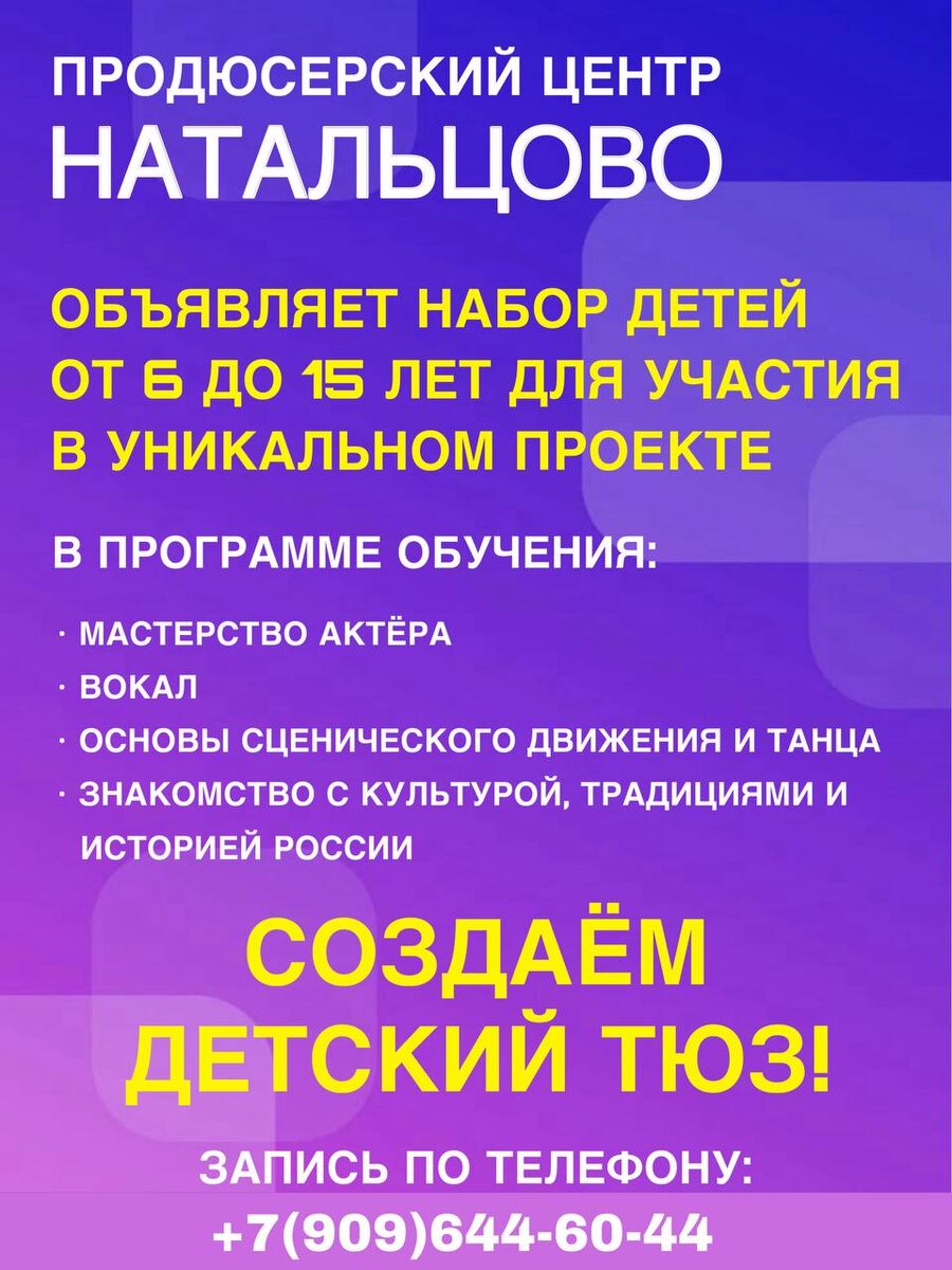 Продюсерский центр НАТАЛЬЦОВО объявляет набор детей от 6 до 15 лет для участия в уникальном проекте.