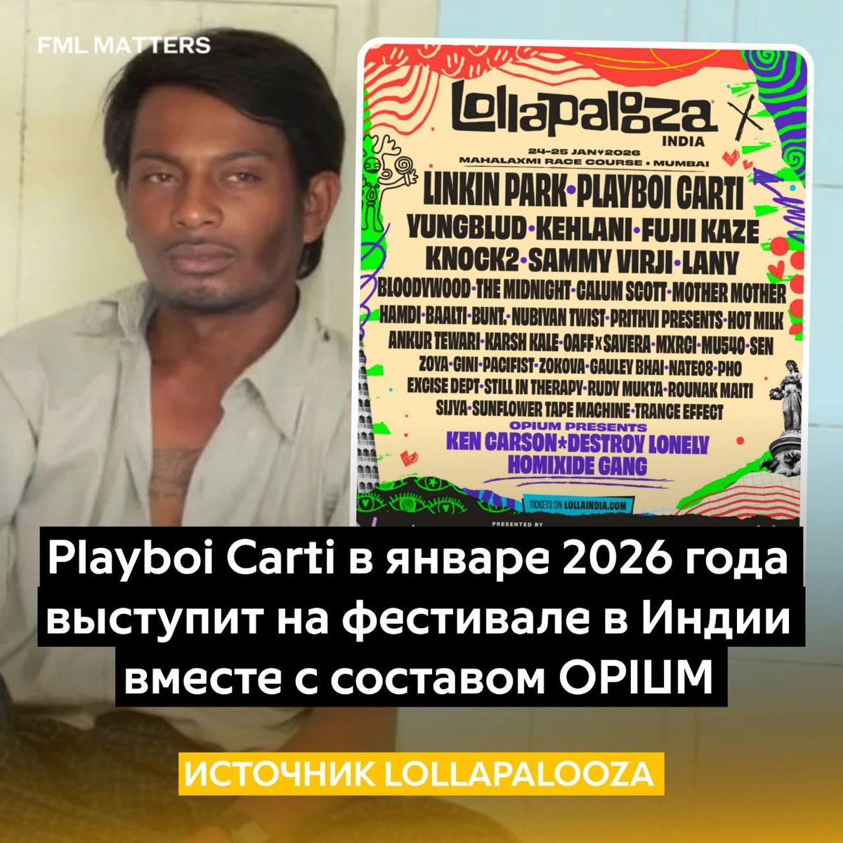 🇮🇳 PLAYBOI CARTI ГОТОВИТСЯ ПОКОРИТЬ ИНДИЮ! Рэпер приедет с концертом вместе с Ken Carson, Destroy Lonely и Homixide Gang на фестиваль Lollapalooza который пройдёт 24–25 января 2026 года в Мумбаи 💀 FML MATTERS