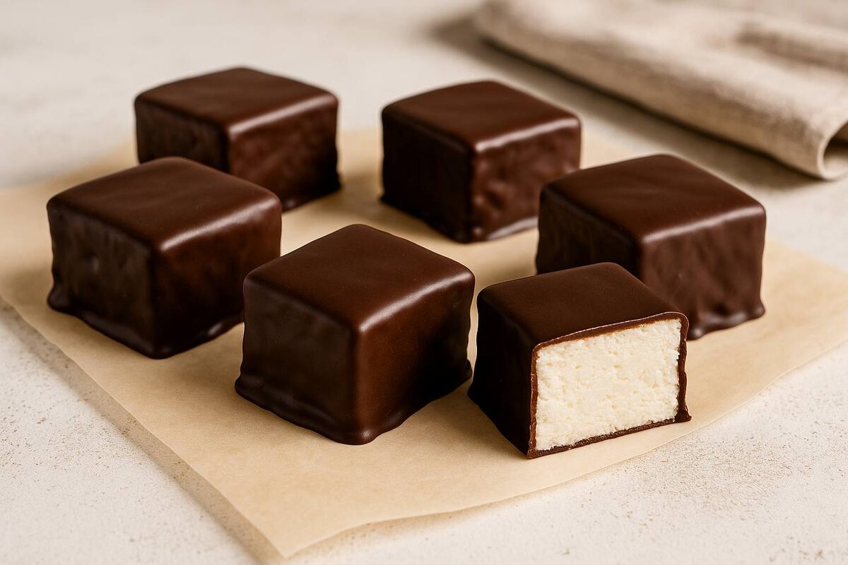 Застывшее суфле нарезаем квадратами или прямоугольниками и окунаем каждый кусочек в глазурь с помощью вилки. Перекладываем на решётку или пергамент до застывания шоколада.