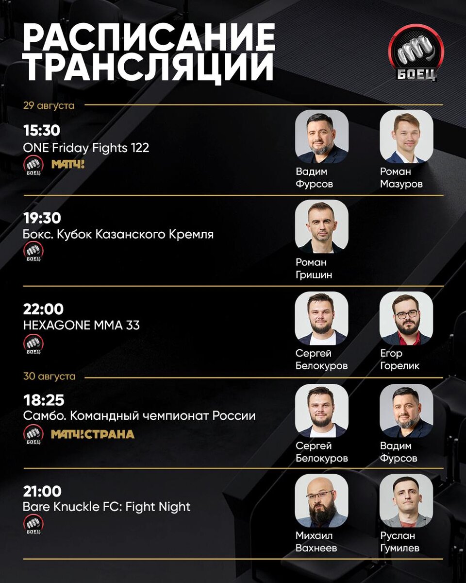 В эти выходные мы без турнира UFC, но скучать не придется. Рассказываем, что будем смотреть на Матч! Боец 📺 Впереди много всего интересного: ONE, бокс, HEXAGONE, самбо, кулачка BKFC 🔥 По традиции бойцовский уик-энд откроет фестиваль единоборств – ONE Friday Fights 122. Турнир возглавит бой Имангазалиева, это надо обязательно глянуть. ССЫЛКА НА ТРАНСЛЯЦИЮ 👈 Еще сегодня нас ждет боксерский вечер Кубок Казанского Кремля, в карде громкие фамилии: Саламов, Мясников, Ионов, Кадиев и другие. А вечером перенесемся во Францию, где пройдет турнир по ММА HEXAGONE 33. ССЫЛКА НА ТРАНСЛЯЦИЮ 👈 Сохраняйте расписание, чтобы ничего не пропустить 😉