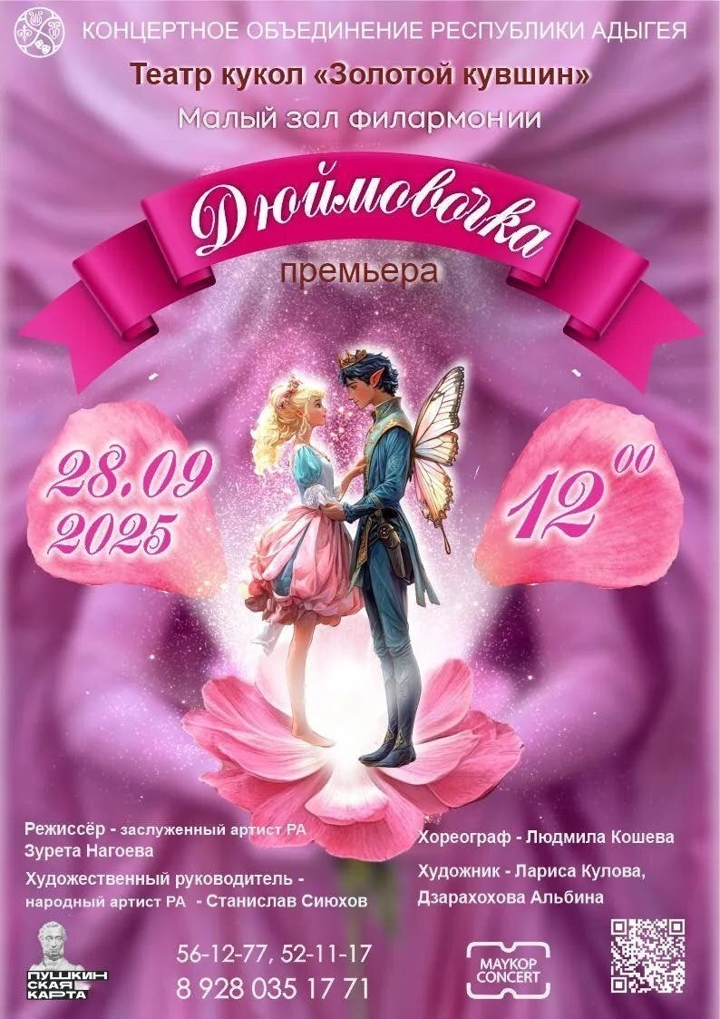 28 сентября в 12:00 театр кукол «Золотой кувшин» представит зрителям премьеру кукольного спектакля «Дюймовочка» по мотивам сказки Г.Х. Андерсена. 🌸Трогательная история о маленькой девочке, выросшей из волшебного цветка, и о ее приключениях. •Режиссер-постановщик спектакля - заслуженная артистка Республики Адыгея З. Нагоева. •Художник-постановщик - А. Дзарахохова. •Художественный руководитель театра – народный артист Республики Адыгея С. Сиюхов. 🏤Малый зал Филармонии Концертного объединения Республики Адыгея 📍Билеты по ссылке #новости_минкульт_РА #КОРА #РеспубликаАдыгея #Победа80