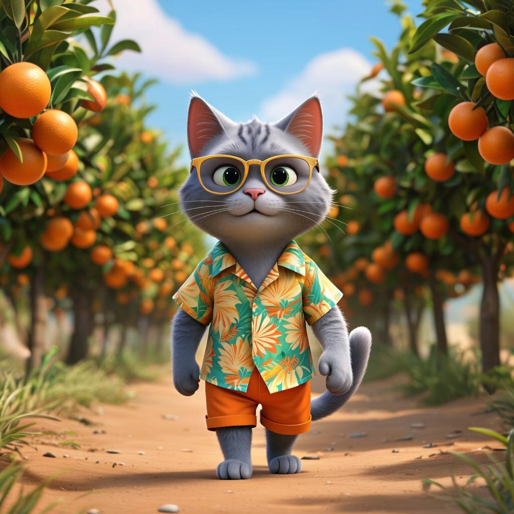 На одном очаровательном островке посреди лазурных вод живёт кот по имени Мася. Из-за ярких аксессуаров и энергичности его запомнил весь городок: широкая гавайская рубашка, удобные оранжевые шорты и крутые золотые очки завершают его стиль. Утро Маси начинается с визита на близлежащий апельсиновый сад, где растут восхитительные плоды. Апельсины здесь крупные, сладкие и удивительно ароматные. Особенно Маси нравятся сорта «Рубиновый» и «Золотистый». Но самая главная особенность сада — дерево по имени Чарли, дающее плоды необычного фиолетового оттенка. Говорят, они обладают особыми свойствами: придают напиткам яркий оттенок и улучшают настроение. Итак, каждое утро Мася отправляется собирать урожай. Взобравшись на ветку дерева, он осторожно выбирает самые спелые апельсины и аккуратно складывает их в плетённую корзину. Затем возвращается домой, моет фрукты и начинает творческий процесс приготовления свежего сока. Процесс занимает особое место в жизни Маси. Сначала он режет апельсины пополам