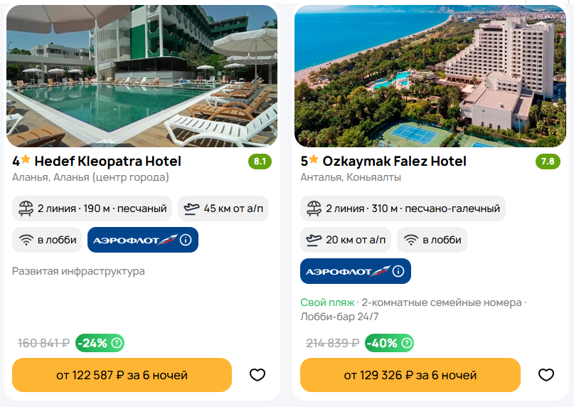 🔥 Туры в Турцию "всё включено" из Санкт-Петербурга на 6-13 ночей🔥 Парочка выгодных вариантов: Тур в отель 3⭐️Sun Shine Hotel, до пляжа 350 м, Кемер, от 6 ночей, всё включено, прямой чартерный. Вылет 3 сентября, от 37658 руб/чел Забронировать: https://checkintime.ru/nntt Тур в отель 4⭐️Hedef Kleopatra Hotel, до пляжа 190 м, Аланья, от 6 ночей, всё включено, прямой чартерный. Вылет 3 сентября, от 61294 руб/чел Забронировать: https://checkintime.ru/r3rb Тур в отель 5⭐️Ozkaymak Falez Hotel, до пляжа 310 м, Анталья, от 6 ночей, ультра всё включено, прямой чартерный. Вылет 3 сентября, от 64663 руб/чел Забронировать: https://checkintime.ru/pinq Все предложения: https://checkintime.ru/sg62 ⚠️Цены на момент публикации и указаны на одного человека с перелетом и проживанием. Переходя по ссылке цена отобразиться на 2-х человек 🏖 Поиск туров | ✈️Авиабилеты