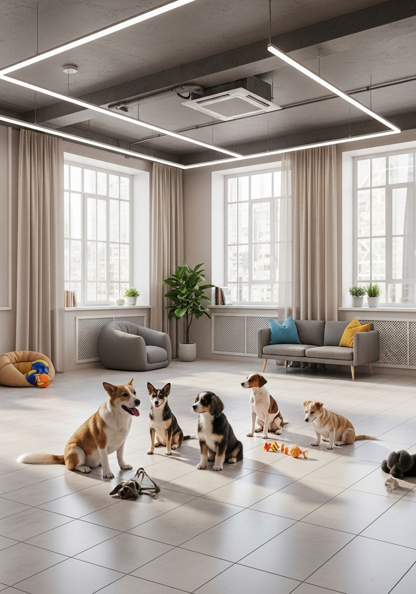 Собаки размещаются в стеклянных номерах, что позволяет постоянно наблюдать за их состоянием. Ежедневная социализация с другими животными и активные игры на свежем воздухе обеспечивают полноценный досуг. Владельцы получают регулярные видеоотчеты утром и вечером.