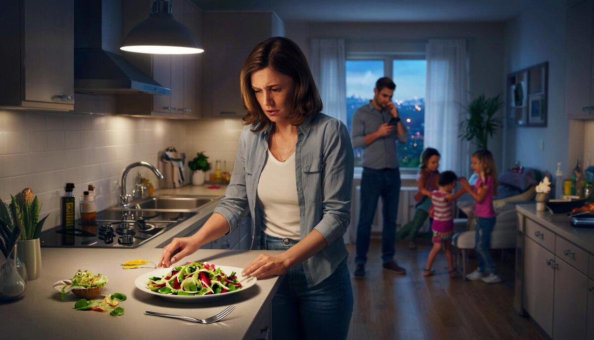 На кухне — двое. Я режу салат на ужин, он сидит напротив, листает телефон. Обычный вторник. Дети делают уроки в комнате. За окном октябрьский дождь…