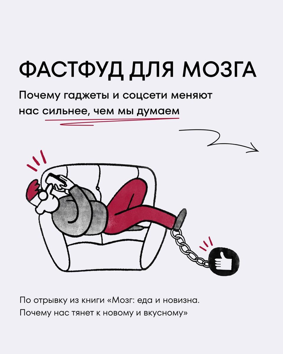 🧠 Наш мозг обожает «информационный фастфуд» — быстрые и легкие удовольствия вроде бесконечных лент соцсетей. Но за них мы расплачиваемся концентрацией, креативностью и даже переменой в структуре мозга. 📚 Профессор Вячеслав Дубынин в книге «Мозг: еда и новизна» объясняет, как гаджеты превращаются в ловушку для нашего сознания и что мы теряем, попадая в нее. В карточках собрали самое интересное.