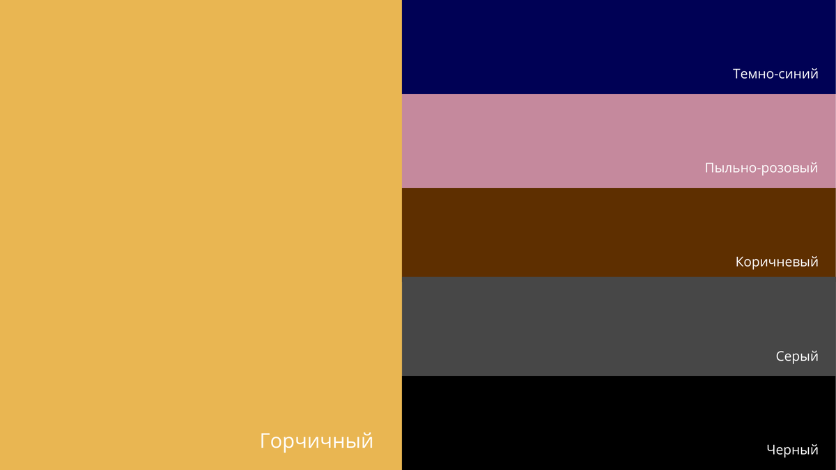 Идеальные союзники горчицы: темно-синий, пыльно-розовый, коричневый, серый и черный цвета.