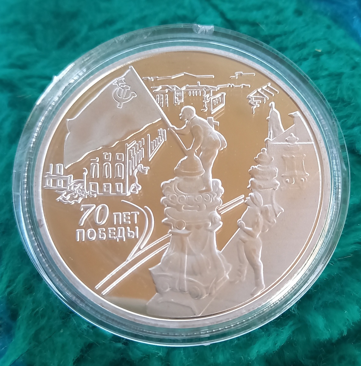Основной сюжет посвящен историческому моменту: изображение флага Советского Союза, развевающегося над куполом здания Рейхстага в Берлине. Это событие стало одним из ключевых моментов окончания войны и символизирует великую победу советской армии.Под основным сюжетом расположена гравировка с надписью «Флаг над Рейхстагом», подчеркивающая значение момента.