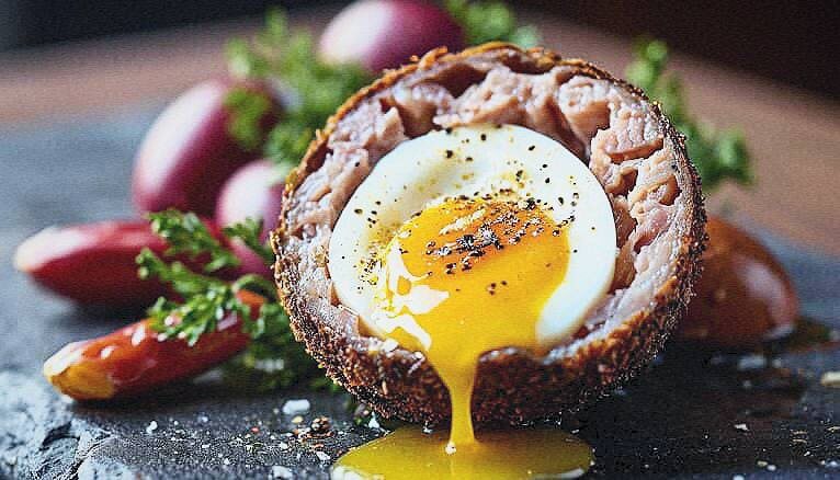 яйца по-Шотландски: Ингредиенты: 4 перепелиных яйца, 400 г мясного фарша, лук, горчица, соль, перец, мускатный орех, петрушка, панировочные сухари, мука, яйцо для панировки, масло. Приготовление: Яйца отварите всмятку (2-3 минуты), остудите в ледяной воде и очистите. Смешайте фарш с луком и специями. Оберните каждое яйцо фаршем, тщательно запечатав. Обваляйте в муке, яйце и сухарях. Обжарьте в разогретом масле (170°C) 6-8 минут до румяности. Нюанс: Ледяная вода после варки остановит процесс приготовления и облегчит чистку. Самое сложное — не переварить яйцо.