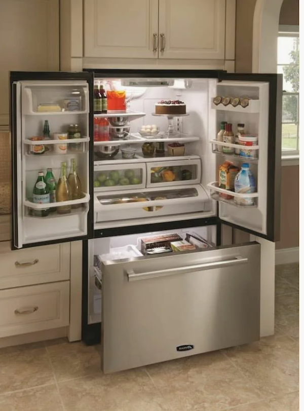 - French Door холодильники (с двумя дверьми в верхней части и выдвижной морозилкой внизу) удобны для организации пространства и часто имеют большой объем.