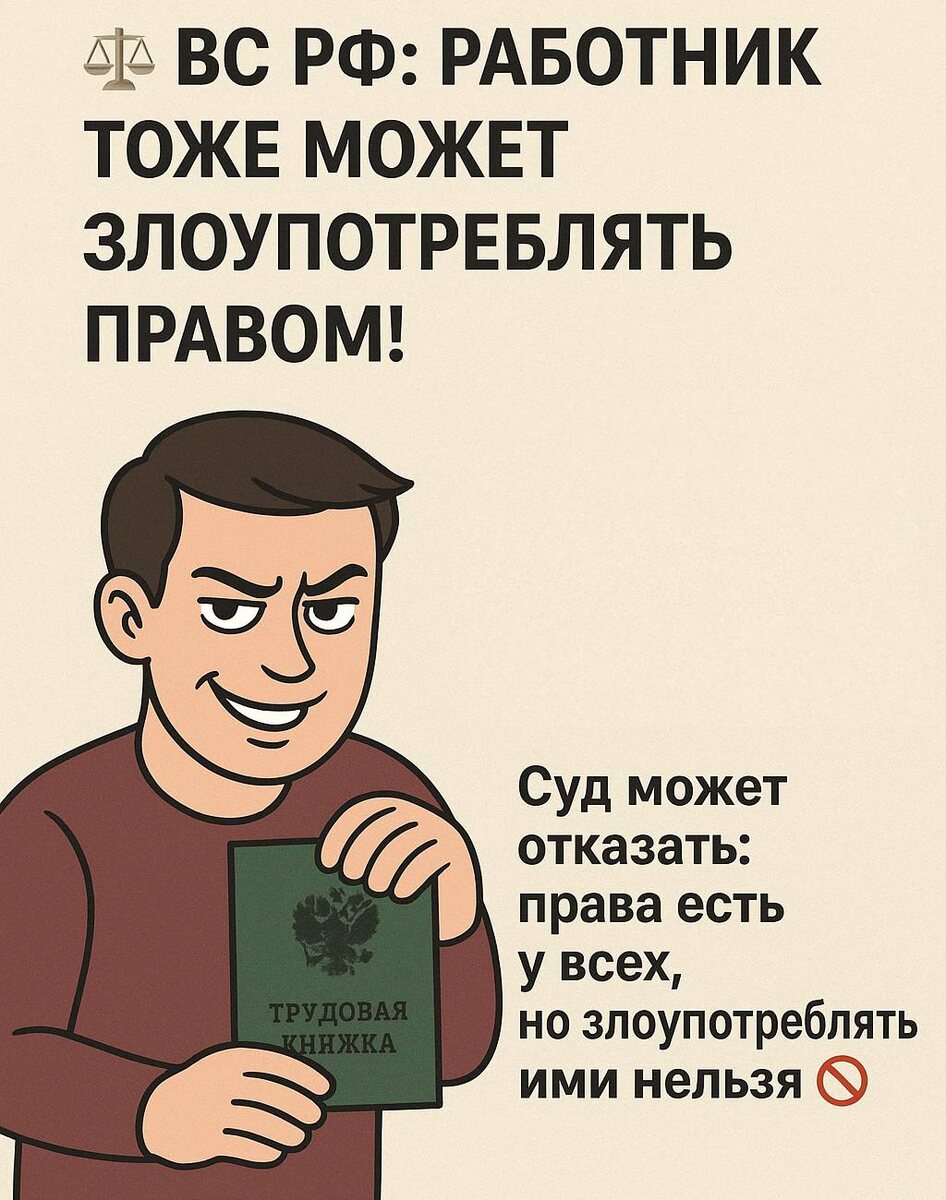 Работника уволили, но он не забрал трудовую книжку сразу, а спустя много месяцев пришёл и… потребовал компенсацию за «задержку выдачи» Суды первой и апелляционной инстанций встали на его сторону. Но Верховный Суд сказал: Ст. 10 ГК РФ — злоупотребление правом недопустимо для обеих сторон. То есть если работник сам тянет время и создаёт видимость нарушения — это тоже повод отказать ему в выплатах. 📌Фиксируйте все уведомления: письма, СМС, звонки, предложения отправить документы по почте. ✉️Предлагайте варианты получения трудкнижки (лично, по доверенности, заказным письмом). ⚖️В споре заявляйте: работник тоже обязан действовать добросовестно. Суды всё чаще смотрят на баланс интересов. Работодатель не должен платить за то, что работник сам «играет в молчанку». Определение Судебной коллегии по гражданским делам ВС РФ от 14.04.2025 № 18-КГ25-37-К4 #ЮристРаботодателя #трудовыеспоры #ВС_РФ #работодатель #ТКРФ #ТрудовоеПраво #злоупотреблениеправом