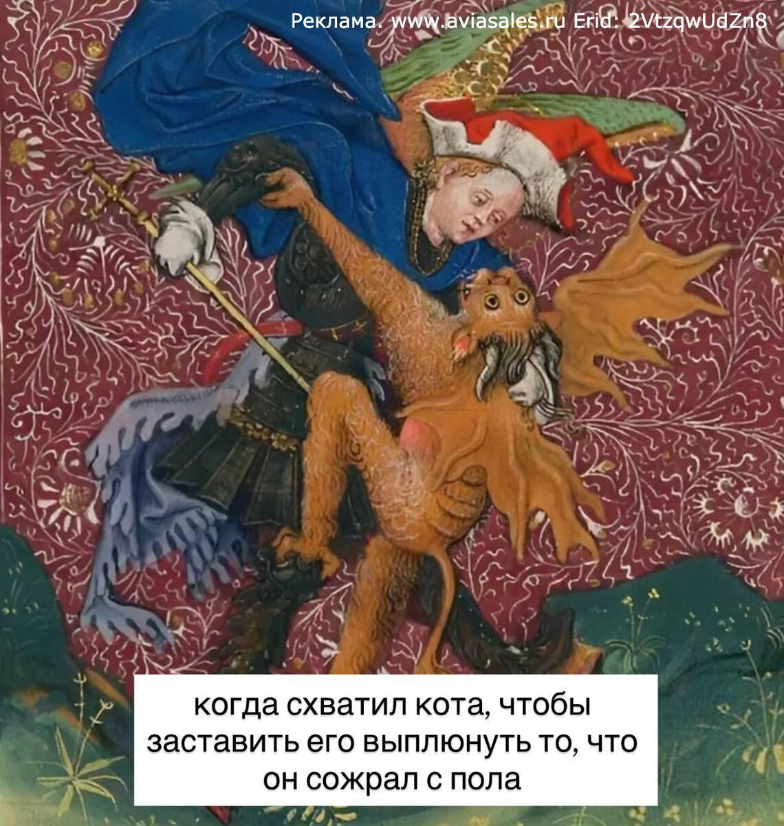 Наши друзья из Авиасейлс попросили рассказать эту историю. С первого взгляда кажется, эти двое сплелись в каком-то диком необузданном латиноамериканском танце. Какие движения, какие взгляды! Однако, если присмотреться, то оказывается, что мужчина наносит несуразному демону смертельный удар. Итак, перед нами — битва архангела Михаила с дьяволом. Это — абсолютно классическая история для всех авраамических религий. Если в христианстве, например, рассказывается как Михаил вёл божье воинство против Дракона в Откровении Иоанна Богослова, то в Иудаизме в некоторых апокрифах рассказывается о победе воинства света под предводительством архангела над воинством тьмы и его владыкой Велиалом. Стоит ещё обратить внимание, что Сатана на данной иллюстрации изображен рыжим. Тут есть сразу несколько смысловых связей: дьявол, как и многие пострадавшие от Инквизиции средневековые женщины, становится жертвой стереотипов. Во-первых связь с огнем — рыжий значит пламенный, а удел нечистого — ад, где всё по