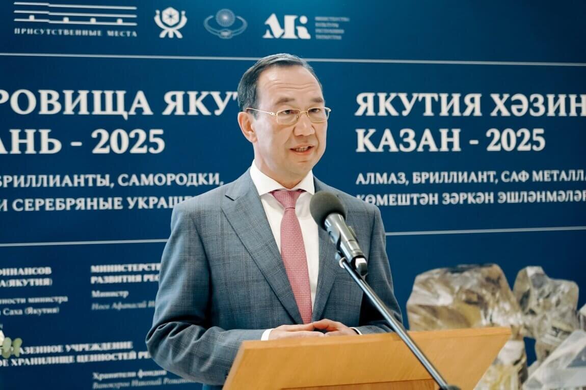 В Выставочных залах Присутственных мест Казанского Кремля открылась масштабная выставка «Сокровища Якутии. Казань – 2025», представляющая уникальное наследие Республики Саха (Якутия) во всем его великолепии. «Когда Рустам Нургалиевич, Раис республики Татарстан, был у нас в гостях в первый раз, он восхитился нашей выставкой, сокровищами, которые там есть. Тогда мы подумали, что придет время и такую выставку нужно будет организовать в Татарстане. Вывести сокровища из Якутии не так просто. Я очень рад, что Татарстанцы вживую увидят бесценный алмаз, который мы назвали в честь столетия ТАССР. В последние годы ряду алмазов мы присваиваем имена героев России – 12 героев и 12 алмазов, часть из которых сюда прибыло в Казань. Я уверен, что такие выставки сближают наши регионы. Когда крепнет дружба между такими республиками как Якутия и Татарстан, крепнет вся наша велика Россия» – поделился Глава Республики Саха (Якутия) Айсен Николаев. Одним из центральных объектов экспозиции и символом дружбы и