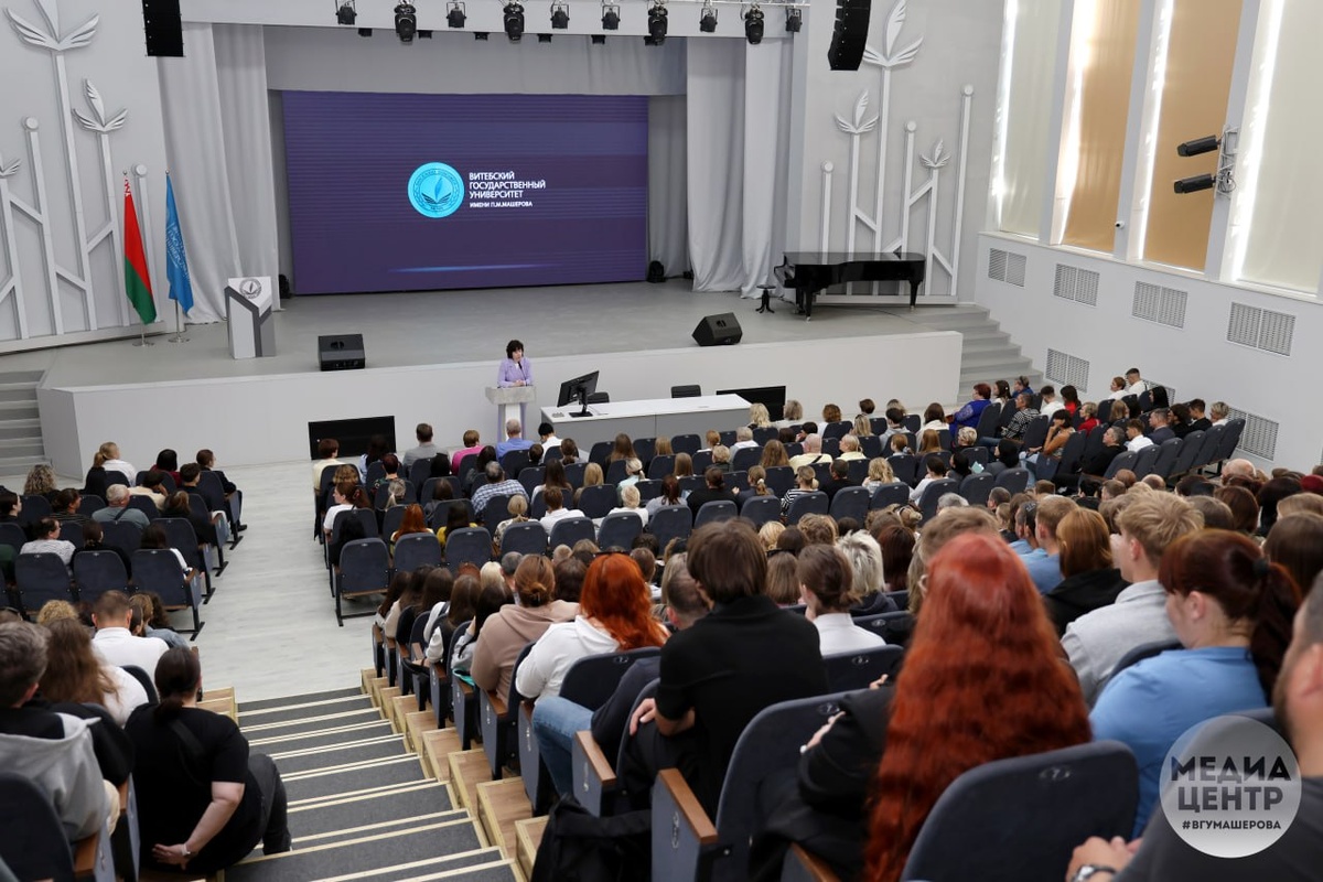 💬29-го августа, в преддверии нового учебного года, в главном корпусе ВГУ имени П.М. Машерова состоялись организационные собрания ректора университета Валентины Васильевны Богатырёвой с первокурсниками всех факультетов и их родителями. 🔵Прежде чем перейти к ключевым организационным вопросам, Валентина Васильевна отметила, что этот год особенный для университета, поскольку ему исполняется 115 лет со дня основания, а значит и для первокурсников первый год обучения будет не менее знаковым, а главное – памятным. — Уважаемые родители и дорогие ребята, я Вас призываю к открытому диалогу, потому что это тот случай, когда такую возможность Вы имеете: задавать любые вопросы. С этого момента первокурсники – это уже не только Ваши дети, но и наши. И мне бы очень хотелось в Вашем лице обрести настоящих союзников, – подчеркнула ректор. 🗣Далее Валентина Богатырёва ознакомила присутствующих с правилами порядка, установленными в университете, а также в общежитиях; подробно рассказала о возможност