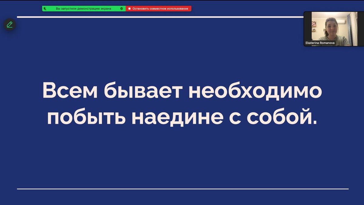 На встрече «Границы в отношениях» мы затронули важную тему: иногда необходимо «побыть в себе», «побыть наедине с собой». Это не зависит от того, насколько человек «экстраверт». Нахождение наедине с собой предполагает разное: это может быть и отдыхом от постоянного взаимодействия с другими людьми в семье и на работе, и восполнением эмоциональных и физических ресурсов, и пространством для саморефлексии и переосмысления своей жизни и много чем ещё. На деле это не всем и не всегда дается просто. Многие готовы понять подобные потребности «побыть с собой» в какой-то асбстрактной ситуации. Но сложно перенести это на реальный опыт, на реальные отношения. Во-первых, сложно понять и принять такую потребность у партнера. «Уйдет в себя, вернется не скоро!», а мне опять все одной решать? Во-вторых, часто и себе не удается выкроить время на встречу с собой: находятся весомые аргументы, уважительные причины, как правило, связанные с ответственностью и заботой о других. Дети, родители, работа,
